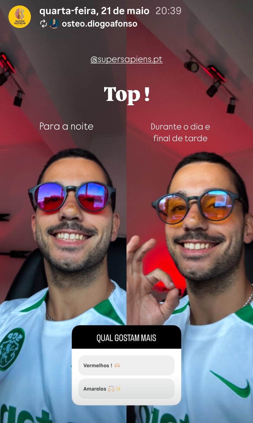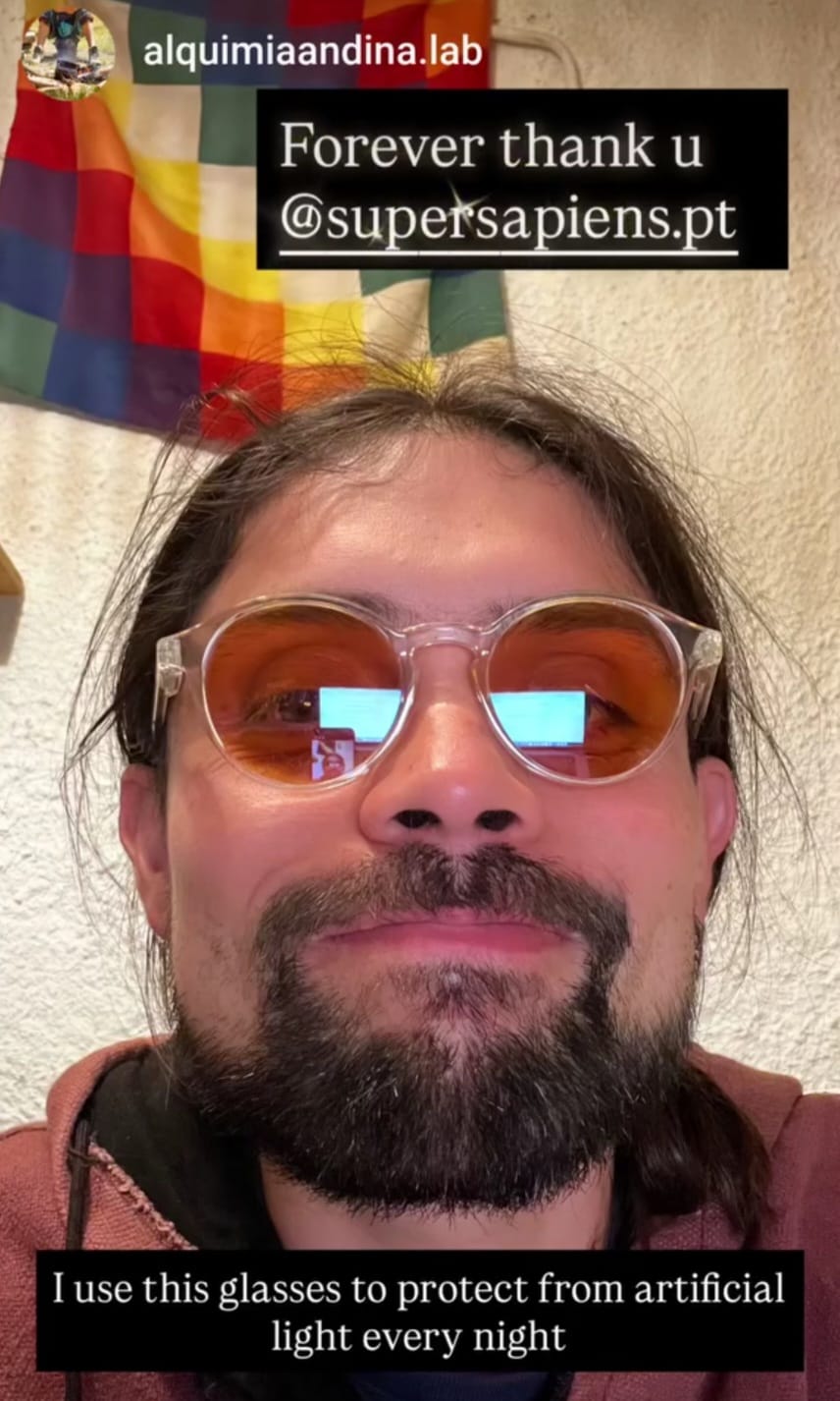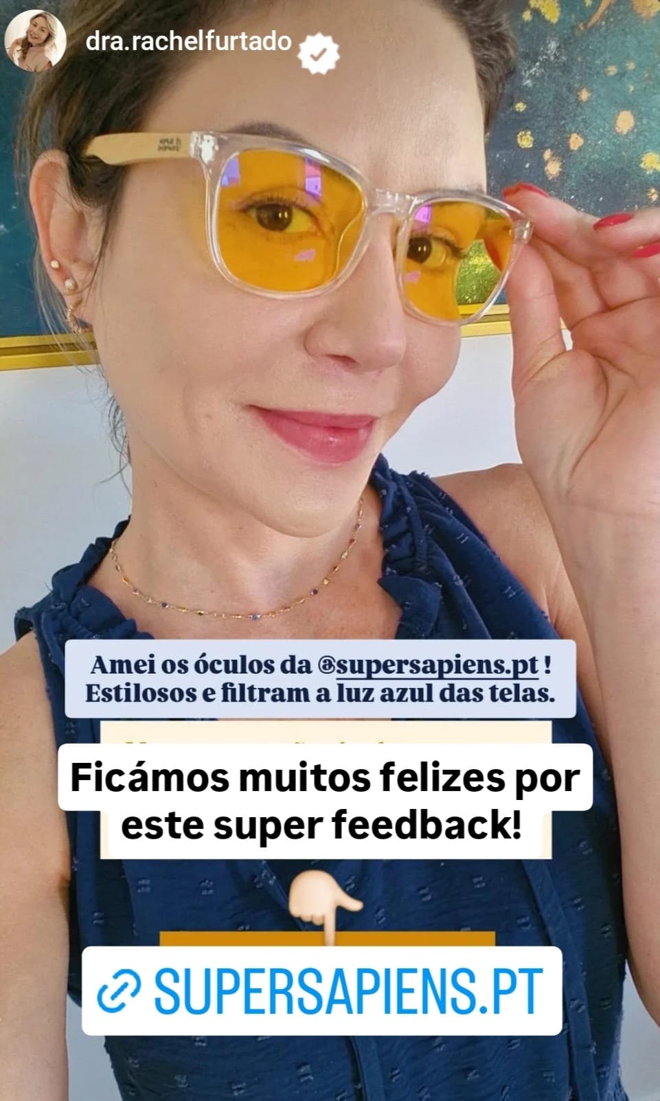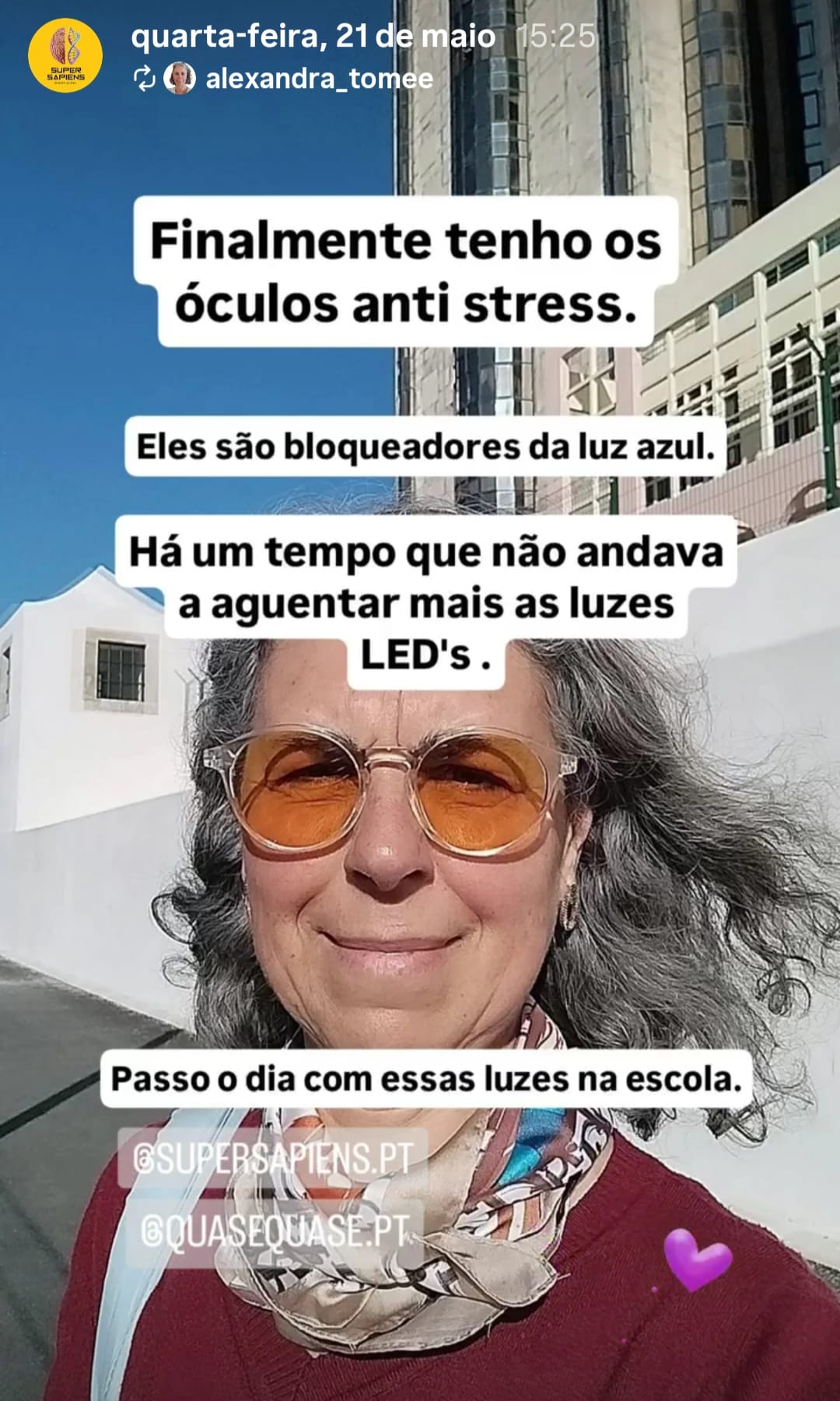 Depois: Proteção com ÓCULOS ANTI-STRESS de lente laranja (bloqueio de 98%), reduzindo a fadiga, suavizando a luz e acalmando a mente.